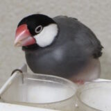 他の文鳥が水浴びをしていても、その大きな顔の迫力でたやすく押しのけ、気ままに水浴びをするアトだが、トミが水浴びをしている間は邪魔をしないで静かにしている。その姿は、少々いじらしい。