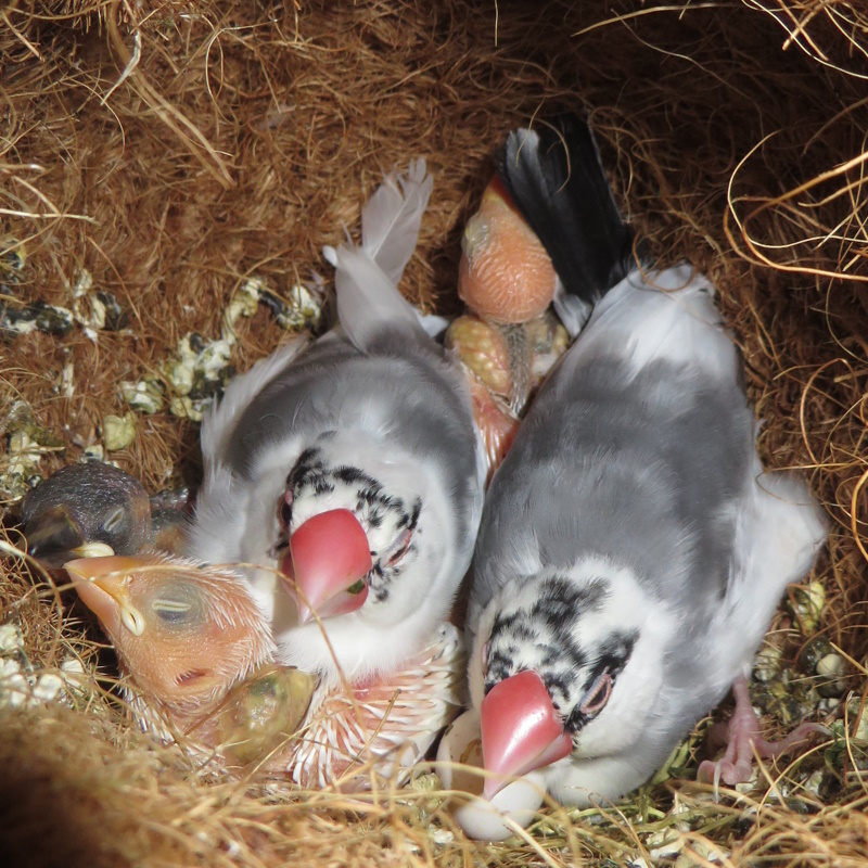 相変わらず夫婦で邪魔をするが、鉄壁ではなくなり丸見えだ。おかげで、奥の白い子の背中が灰色なのがわかる。つまり、1840年代の絵画史料、おそらく将軍家の飼育する珍しい色あいの文鳥(「替文鳥」と、白文鳥のヒナと思われる姿を、そのまま実証実験できたわけだ。ごま塩ペアをしいくしたらより白っぽい文鳥のヒナが生まれたぜ!by将軍家「手放したくね~!」の再現だ。ようするに、潜性白文鳥の出現は1840年代で、弥富系の白文鳥よりも20年程度古いと見なして良いかと思う。