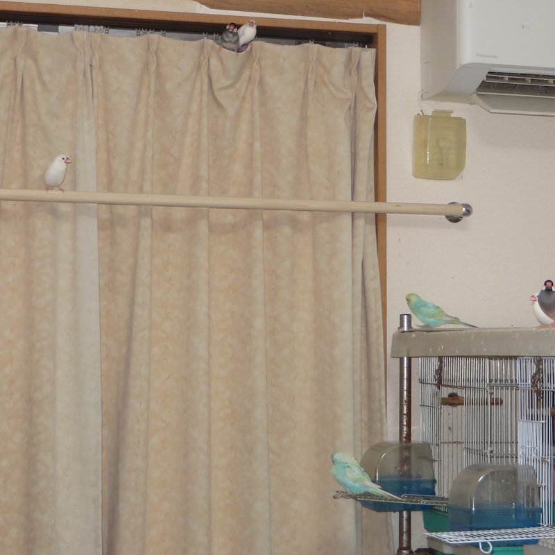 ↑はカーテンレールをなくしたのに、トッピ&オレのデート場所となっていて、その様子を見ているハマーが・・・、普通に太い止まり木利用者になった。これ、ハマーが焼きもちを焼いてのことなら良いのだが、たんにカーテンの隙間に行ってみたいだけで、今のところ、禁断カップルの邪魔をする者が現れない。どうやってこの近親恋愛関係の仲を裂くか、思案中だ。