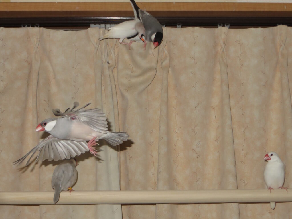 宿泊部屋のシルバーペア、ネヅ(ウチの子)とカエも仲の良い友達で相手の浮気心を気にしない関係だが、これは時間の問題だろう。トッピ(コッペ&イッパの白い娘パート2系図に不記載)とハマー(ごま塩同士から生まれた江戸系白文鳥)は、↑のような感じだが、徐々にハマーに嫉妬心が育っており、↑の浮気なふたりを邪魔したい気分になっているようだ。また、ジャイ太(コビィ&トムの息子の息子)とエド(ごま塩同士から生まれた江戸系白文鳥)も別にケンカはしない関係で、エドちゃんはジャイ太の兄の白文鳥がアタックを始めており、ジャイ太と入れ替えの可能性もあるが、ジャイ太次第だ。