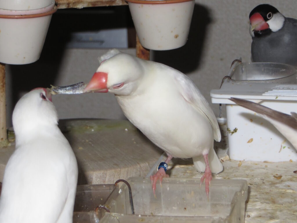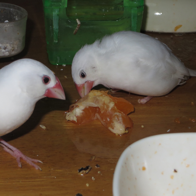 ↓トッピが育てる江戸系白と何だか白の子たち。↓↓脚がないナイはみかんを吸うのが好き。↓↓↓煮干しをを加えて自慢しまくり横取りされそうなほっぺ腫瘍のマダラと、奥で殻むきしている7歳のさっちゃん。
