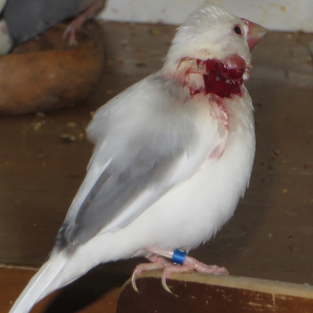 16日朝、生存を確認。昼はたびたび水浴びをしていたが、「夜会」の際は↓のような様子だったので、ぬるま湯とヤシの実洗剤少々で洗ってふいて自力で乾かして↑となった。↓↓(※血まみれなので苦手な人は見ないように)のような様子だったにしては、まだ血色も保っていて余力がありそうだ。よほど丈夫なのだろう。