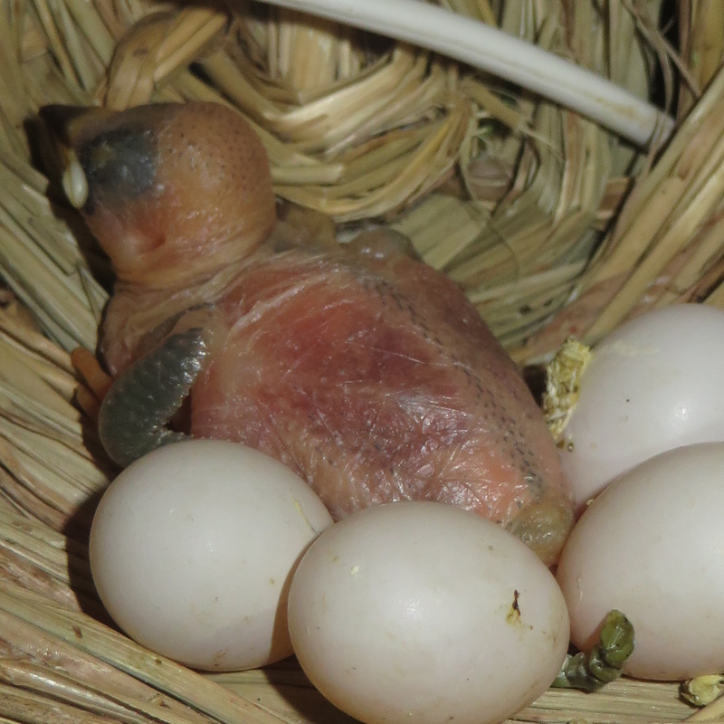 さて、昨夜↑のように夫婦で遊んでいて、↓のようにヒナが放置され、成長も滞っているようなので、孵化13日目の今日引き継いだのだが・・・、すでに巣の中で冷たくなっていた。今、左手に亡骸があって、息を吹き返さないものかと思っているのだが、そういうことはないだろう。ほんの1時間の遅れが生死を分けてしまった。