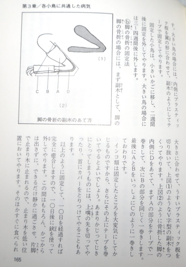 初診料2000円ほどだけ払って帰って、そうだ、高橋達志郎を確認していなかった、と『小鳥の飼い方と病気』を見れば、イラストが重要なので画像で載せるが、当然のように脚骨折の際の治療法が載っている↓。