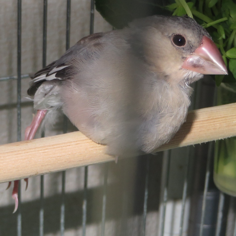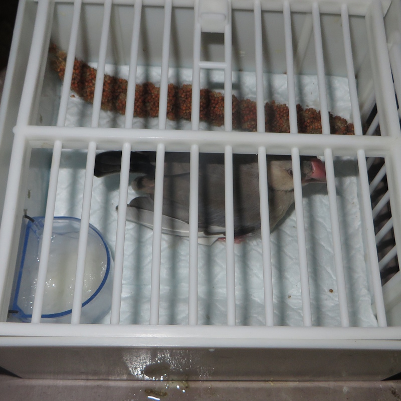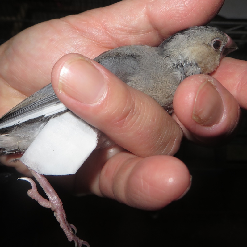 ではこの場合は・・・、とりあえずテーピングのフチを切って縮めて、ついでに換羽期で邪魔な羽毛をむしってやった。それでも取ってしまう可能性は高い。ので、その際は・・・高橋達志郎流、昔の石膏ギプスのように完璧に動けなくする方法が、小鳥の整形としては無難な方法ではなかろうか。しかし、あれを一人でちょちょちょいとするには、「場数」が必要で20年に一度ではどうにもならぬ。道具をそろえシミュレーションを繰り返して、何とか出来たとしても、止まり木に止まって骨折した脚をぶらぶらさせるような真似はできなくなり、1週間は床面生活が必要だろう。