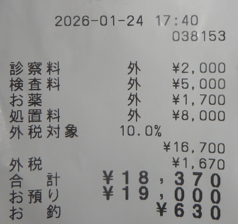 13年前に目星をつけていた動物病院に朝方予約を取って(窓口の応対は好印象であった)、17時に行った。待ち時間はほぼゼロで、中性的な柔らかな物腰の白髪の男性先生(サイトにある若い頃の画像から変貌している)が、レントゲンを撮って、3人がかりで医療用の紙テープをテーピングしてくれた。痛み止めに「MSA」と言っていたので、たぶんネクトンのMSAを加えたものを処方してくれた。で、18,000円が消えていった(念のため言っておくが、↑画像のレシートのこの病院が高いわけではない。人間並みに3割負担なら5,400円で、常識的かと思う)。