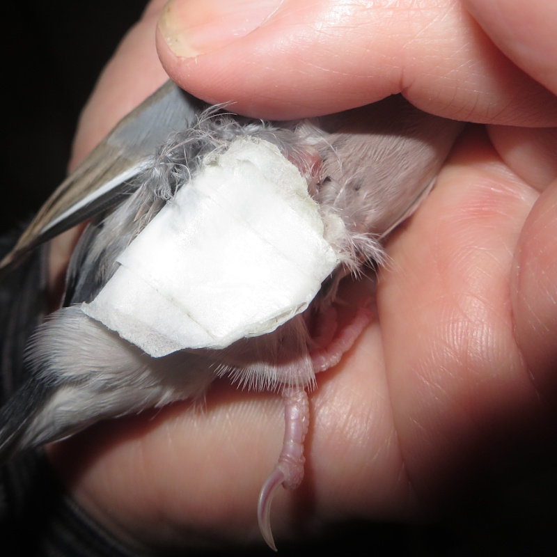 私の場合は、3人がかりテーピングが2っか目にはがれだしたので、↓面積を小さくしてカーブを作って文鳥自身から目立たないようにして、医療用の紙テープ(何でそんなものがあるのか?宿泊するお客さんの食器に目印をはるためである)をぐるぐる巻いただけだが、それで今もキープされている。「クロダ」も気にしていない。文鳥の視界から消えるようにする、これがポイントだと思う。参考までに。