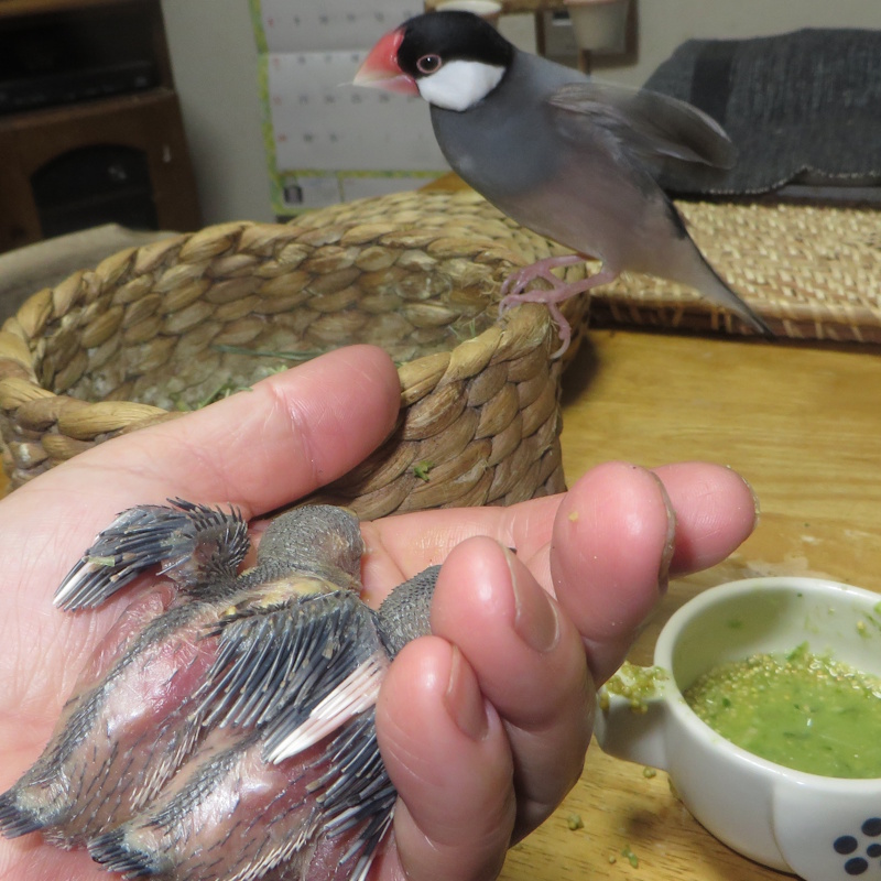 引き継ぎ後、タイシに子供たちを見せたが↓、巣から離れたら関係ないそうで、つれない反応であった。どこぞの半ズボンの時に文鳥を飼っていたとか言っている獣医師が親鳥と一緒に育てるとか絵空事(うまくいくのは特殊例)を一般化できることとして書いていたが、ウチではタイシの態度が普通で、おそらくこちらが自然だろう。巣から離れたヒナを自分のヒナと認識して育てるなど、本来あり得ないのである。