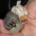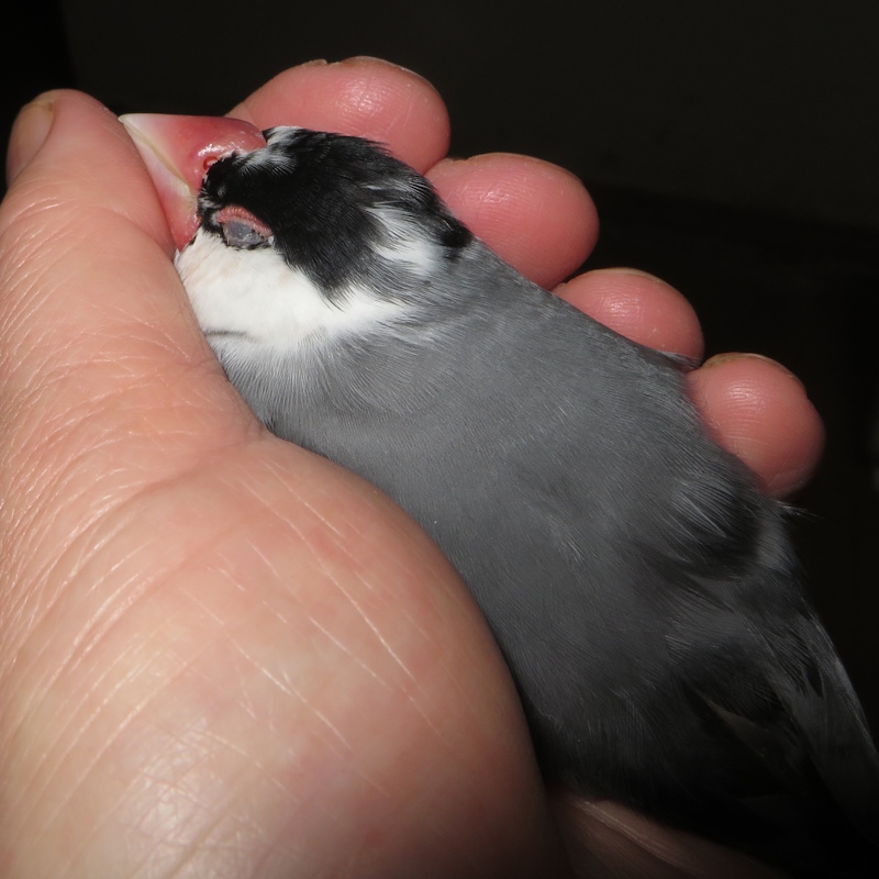 衰弱に気づいて、「ツイカがんばれ!」と声をかけ、それに反応するように巣の中に入って出て来なくなった。そこを死に場と定めたか、と思ったが、夜会の放鳥時(21時)に巣の中に手を入れると、まだ息があった。取り出し↑の状態であったが、心臓は弱弱しい鼓動で、臨終に近づいているのはわかった。