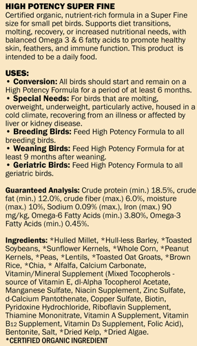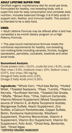 「HIGH POTENCY SUPER FINE is a year-round formula for canaries and finches as well as budgies (parakeets) and other small parrots.」