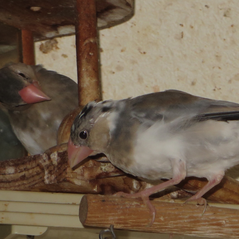 これにより、私の理論は実証を得た。ごま塩文鳥、つまり、江戸系白文鳥と桜文鳥の雑種には、ヒナの時は桜文鳥の姿で徐々にごま塩化する系統があることが実証され、それは、人為的により濃い姿のヒナを求める選択圧力により人為淘汰された結果だとの推論が現実味を帯びた、と言える。