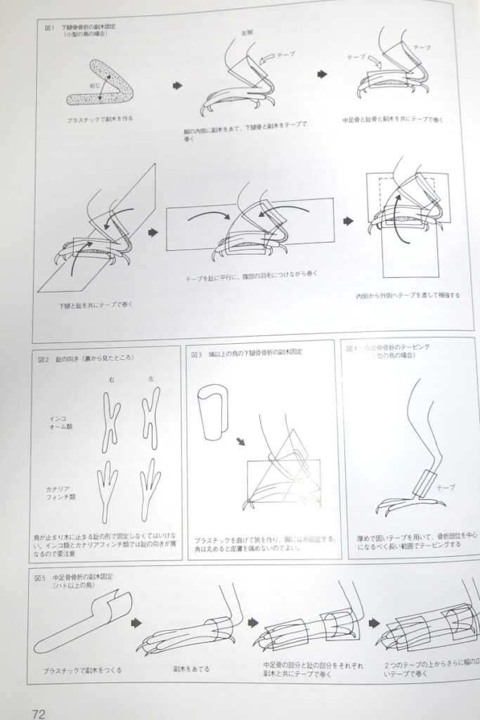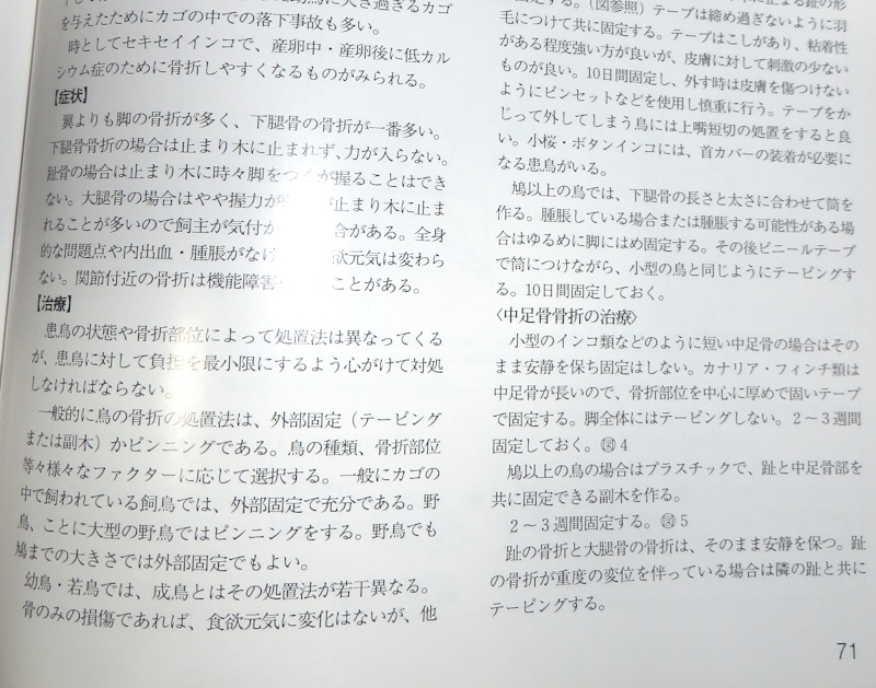つまり、最近の臨床マニュアルには骨折の際のギプス固定の記載がないようだが(他に手段が書かれていないと言っていた)、昔のマニュアルにはあるだろう、と類推したのである。何しろ弟弟子が実演して見せたやり方は、師匠の高橋達志郎が一般向けの本で紹介されているものそのままなので、ご自身の一般書(『手乗り鳥の健康の本』2002年刊行)では何もせず安静を説いている「姉」石森先生も、専門書の方には記載しているに相違なく、確認して、今の動物臨床医に、