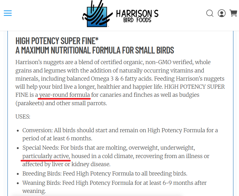 日本で一部の鳥系の動物医療の臨床医が、2000年頃から激しく「推し」活動しているのは、商品名のフォーミュラを処方と訳して、何か偉い先生のお墨付きがある「処方食」と勘違いしたのではないか疑っているが、たんにメーカーが最善と信じる配合で調整しただけで、その点は他のメーカーと差別化はできない。各メーカーが最善と信じる方法でそれぞれ勝手に商品化しており、どれが一番優れているとは言えないのである。
