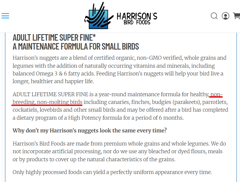 誤解のないように断っておくが、ペレットは大型インコ用に開発され、その目的で使用するには推奨されるべきものだと思っている。ただ、鳥種による相違をわきまえず、手のひらサイズの小鳥にも同様な必要性があると見なした点に問題があり、四半世紀を経た現在は、本来の2倍の栄養(脂肪価≒エネルギー量)を持ち、換羽や繁殖時に推奨されていたものを、日常食に位置付け直すようなことになっていると、ハリソン社の製品説明を読む限り、受け止める以外なくなっているのは残念、としなければならない。さらに、そのメーカー側の認識の変化を、しっかり受け止めている使用者は少ないように思われ、とても問題だと思う。特に、他人に薦めたり売ったりするような人は、メーカーサイトのチェック程度は行ってもらわないと無責任のそしりは避けられないのではなかろうか?